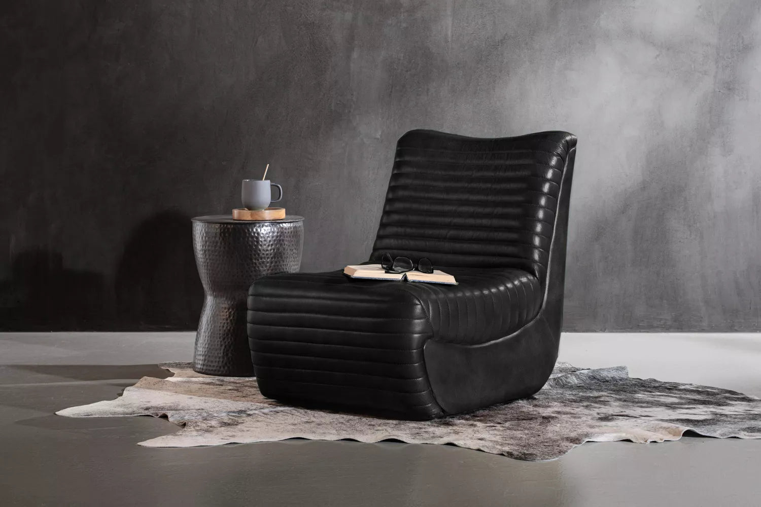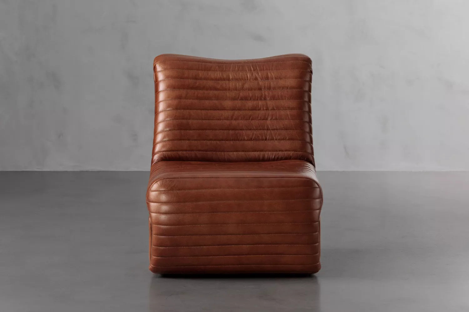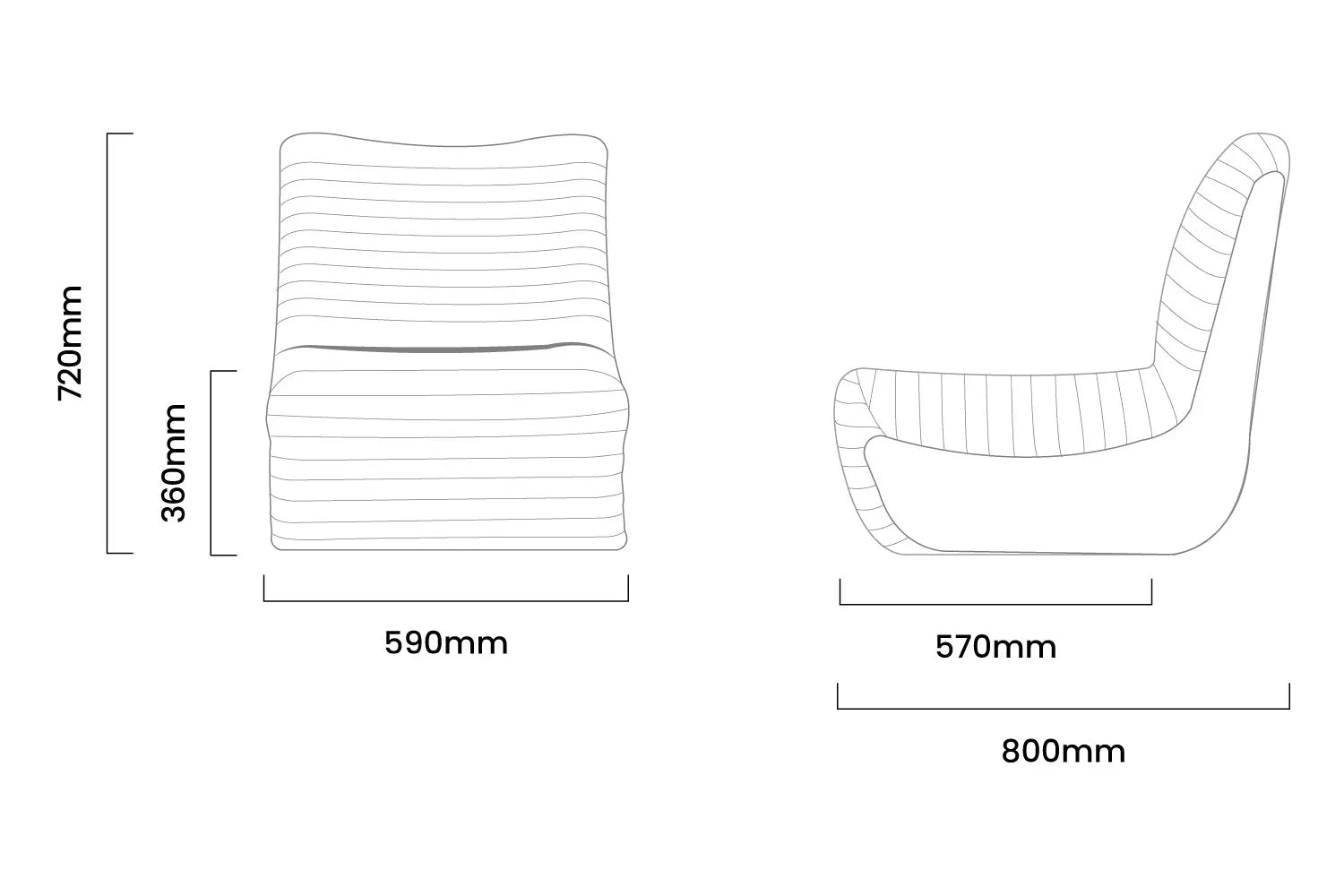 Su estructura baja y ergonómica se adapta al cuerpo, brindando una experiencia de descanso profunda. El corte lineal le aporta dinamismo visual, mientras que su forma curva sin brazos crea una silueta moderna ideal para espacios contemporáneos o industriales.
