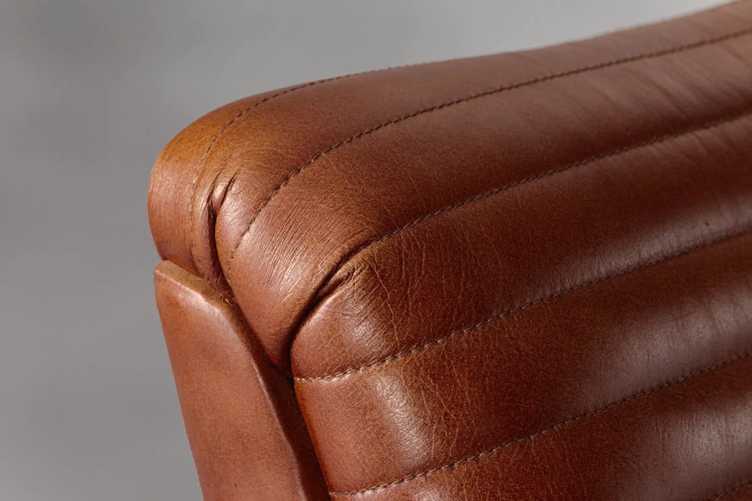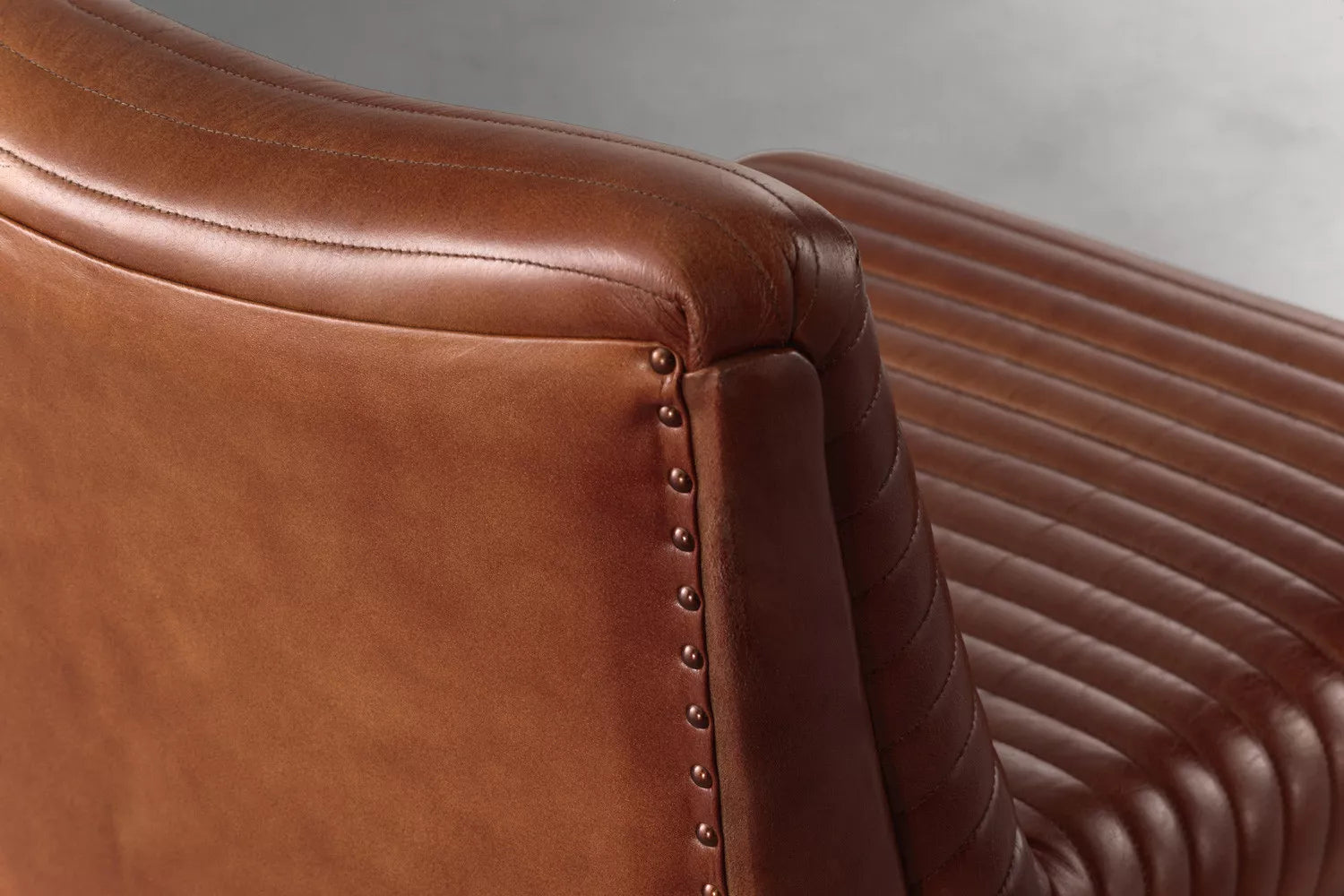 La Poltrona KYUS con diseño envolvente, líneas continuas y una estética retro-futurista definen esta butaca tapizada 100% en cuero natural.